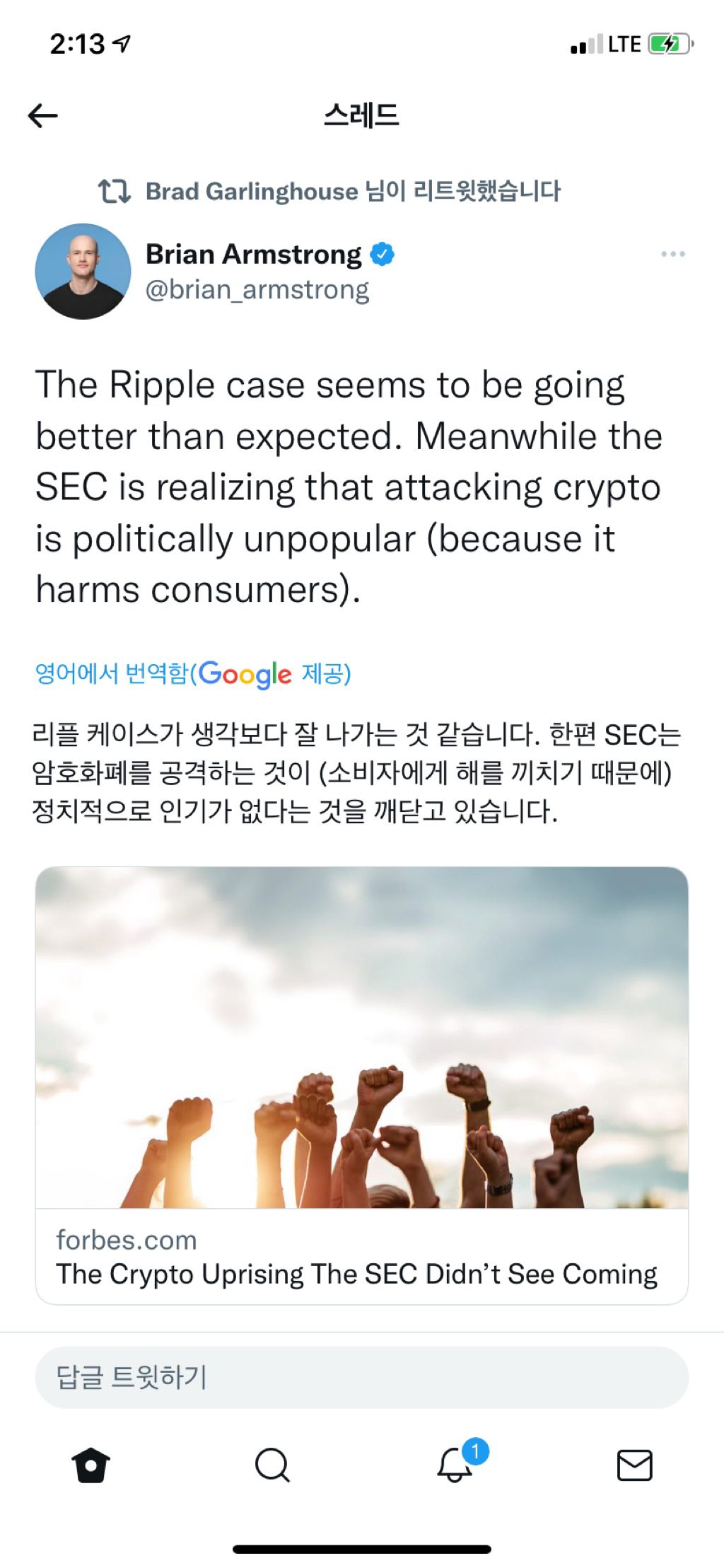 그런데 최근 리플코인 가격이 급등했어요.700원대에 있던 리플이 지금 1100원까지 올랐는데 과연 무슨 일이 있어서 이렇게까지 상승할까요?우선 비트코인이 다시 살아남에 따라 리플도 반등하는 것입니다.두 번째 이유로는 아까 말씀드린 SEC 소송에 관한 이야기가 있습니다.